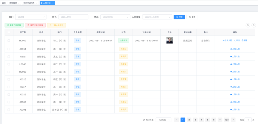 用于配置人脸注册的审批流程、人脸参数。并对前端用户上传的人脸照片进行数据处理,并将人脸库下发至相应的课室终端设备中。