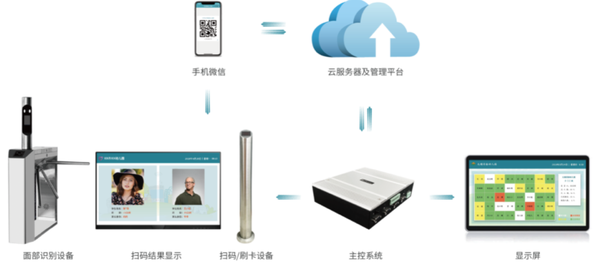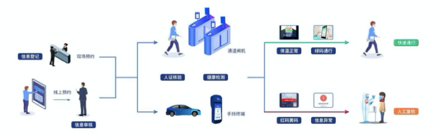 2、防疫终端将根据政数局云平台返回的数据,与学校的防控规则进行验证。如果全部满足,则通道开闸放行。否则语音报警提示,闸机不给予放行。
